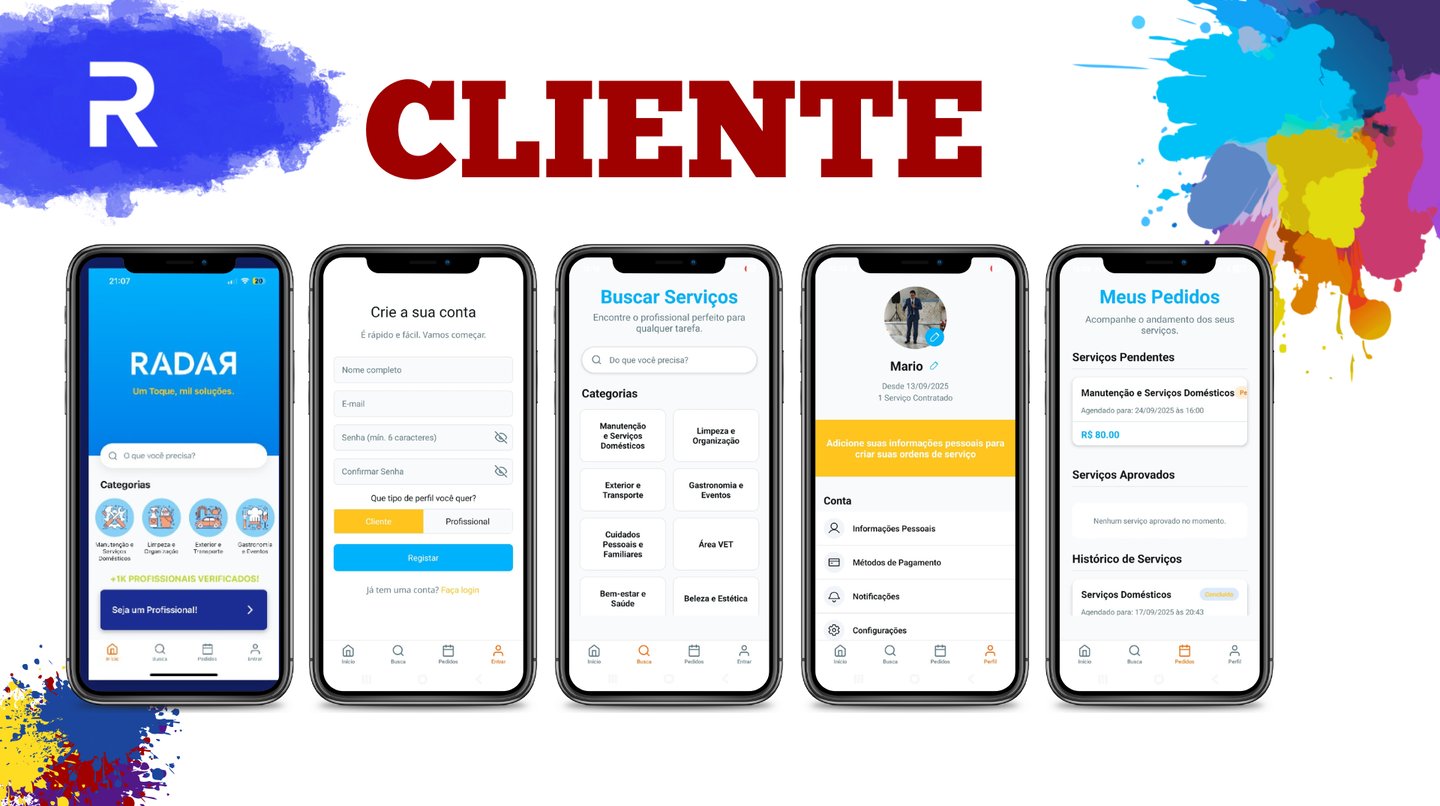 Para você, CLIENTE: Será a tranquilidade de encontrar o profissional certo para qualquer serviço, na palma da sua mão. De uma diarista de confiança a um eletricista qualificado, no Radar Pro você poderá ver avaliações, negociar e contratar com total segurança.